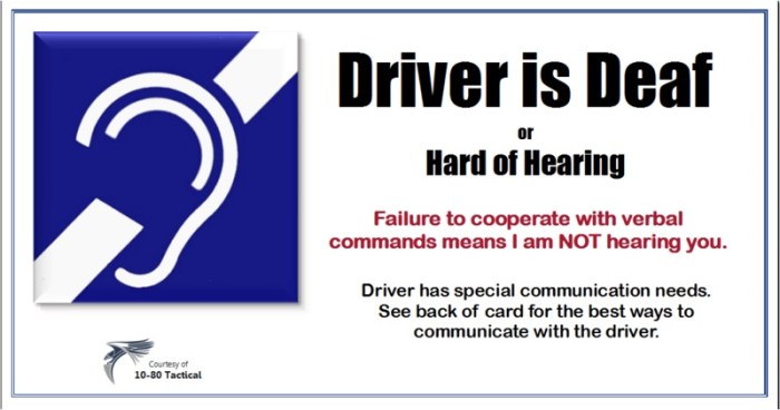 A cop pulls you over. Make sure you have a placard or sign saying you are deaf or hard of hearing, like the one pictured above. That should be the first thing the officer sees when he comes up to your car door. A few years ago, there were several incidents involving deaf drivers pulled over that went seriously, in at least one case fatally, wrong. I wrote about it in this post, Hazards of Driving While Deaf. Here’s a link to HearingLossHelp, where you can download and print your own sign.
